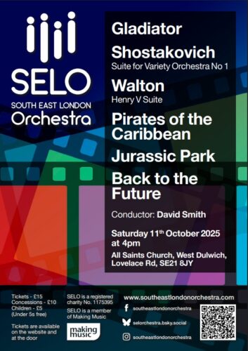 SELO is back for our 2025/26 season with our next concert, on Saturday 11th October 2025 at 4.00pm at All Saints Church, West Dulwich. We will be featuring music from film scores by Shostakovich and Walton, as well as music from classic films.
